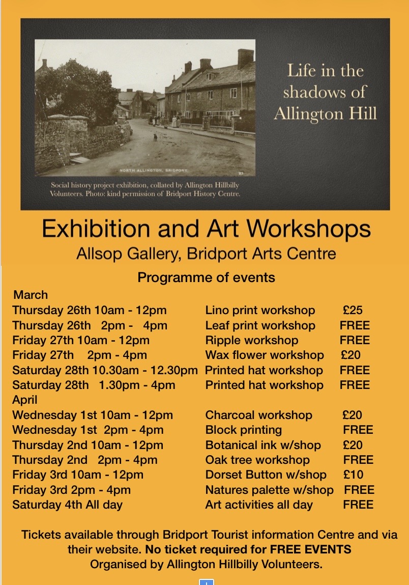 "Living in the shadows of Allington Hill" exhibition. "Nature in Art" A series of workshops for all ages. Allington Hillbilly Volunteer shop. |