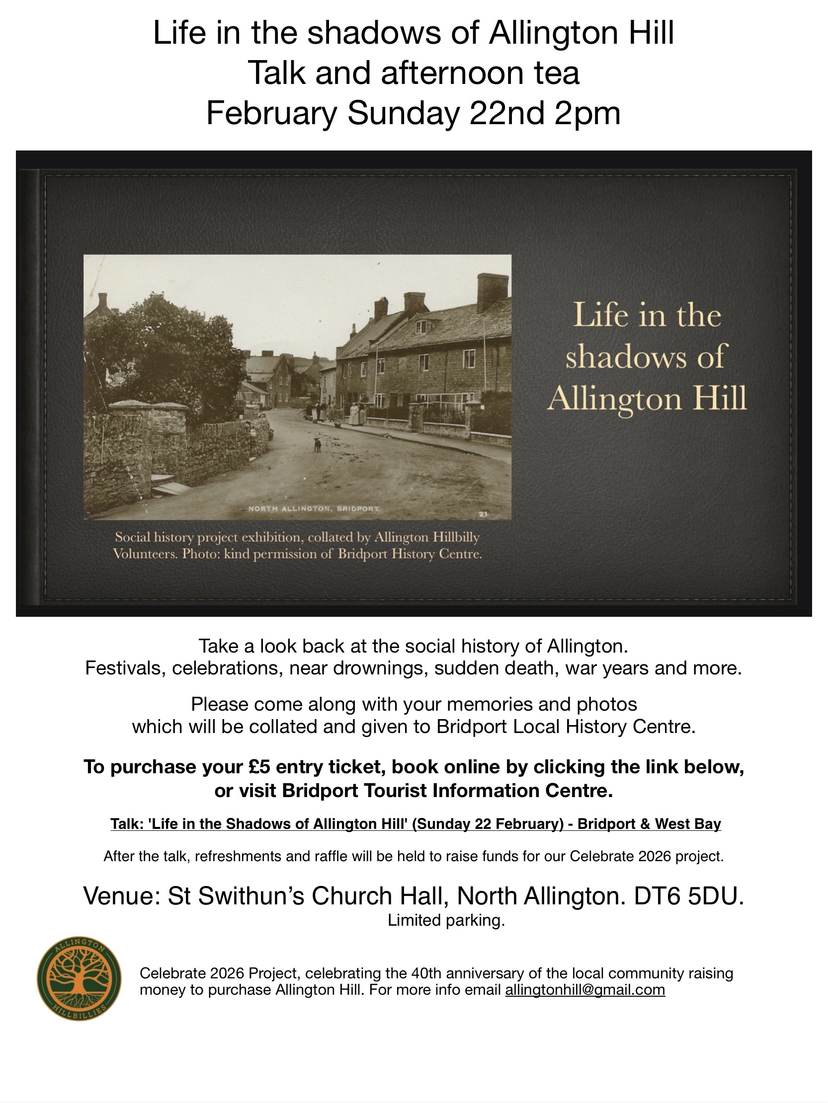 "Living in the shadows of Allington Hill" Talk and afternoon tea, looking back through time and how Allington is today. Inviting people to share their memories and photographs |